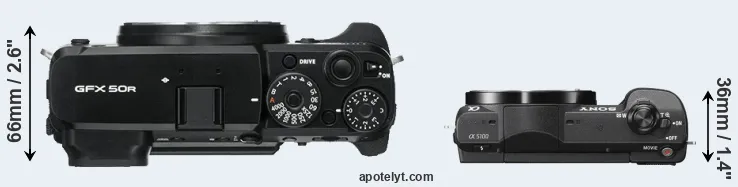 La Fujifilm GFX 50R e la Sony Alpha A5100 sono due fotocamere digitali rivelate al pubblico rispettivamente a settembre 2018 e agosto 2014. Entrambe sono fotocamera mirrorless con obiettivo intercambiabile, che sono dotati di un sensore di medio formato (GFX 50R) e un sensore APS-C (A5100). La Fujifilm ha una risoluzione di 51,1 megapixel, mentre la Sony fornisce 24,0 MP.