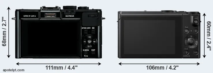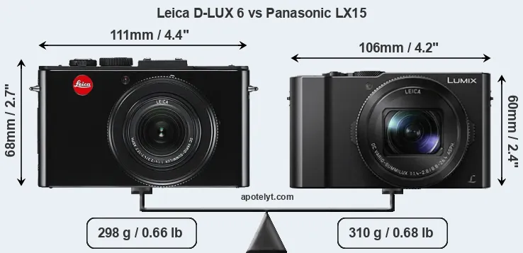 La Leica D-LUX 6 e la Panasonic Lumix DMC-LX15 sono due fotocamere digitali rivelate al pubblico rispettivamente a settembre 2012 e settembre 2016. Sia il D-LUX 6 e il LX15 sono fotocamere compatte con obiettivo integrato, che sono dotati di un sensore da 1/1.7 pollice (D-LUX 6) e un sensore da 1 pollice (LX15). La Leica ha una risoluzione di 10,0 megapixel, mentre la Panasonic fornisce 20,0 MP.