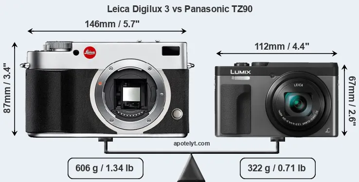 La Leica Digilux 3 e la Panasonic Lumix DC-TZ90 sono due fotocamere digitali rivelate al pubblico rispettivamente a settembre 2006 e aprile 2017. Il Digilux 3 è una fotocamera DSLR, mentre TZ90 è una fotocamera compatta con obiettivo integrato. Le fotocamere sono dotati di un sensore Quattro Terzi (Digilux 3) e un sensore da 1/2,3 pollice (TZ90). La Leica ha una risoluzione di 7,4 megapixel, mentre la Panasonic fornisce 20,2 MP.