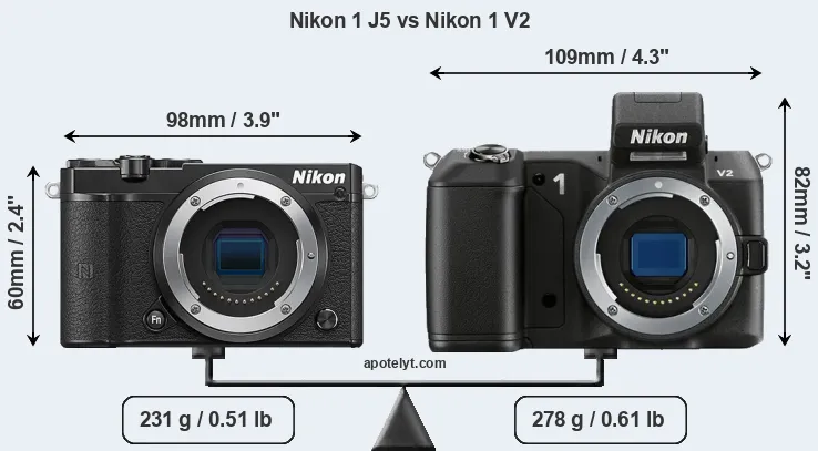 La Nikon 1 J5 e la Nikon 1 V2 sono due fotocamere digitali rivelate al pubblico rispettivamente a aprile 2015 e ottobre 2012. Entrambe sono fotocamera mirrorless con obiettivo intercambiabile, che sono dotati di un sensore da 1 pollice. La J5 ha una risoluzione di 20,7 megapixel, mentre la V2 fornisce 14,2 MP.
