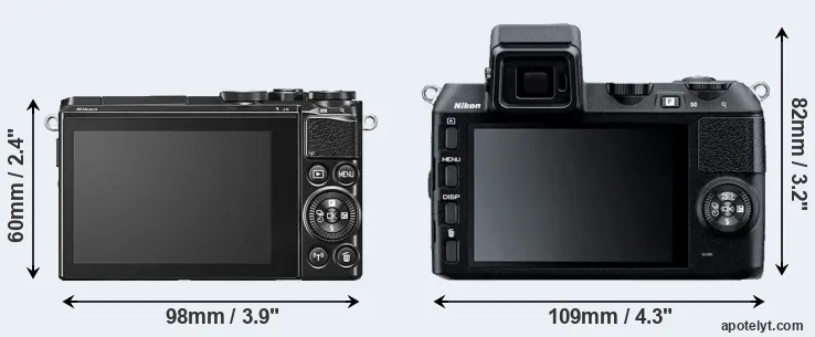 La dimensione fisica e il peso della Nikon 1 J5 e Nikon 1 V2 sono illustrate nel grafico sottostante. Le due fotocamere vengono visualizzate in base alle loro dimensioni relative. Tutte le dimensioni sono arrotondate al millimetro più vicino.
