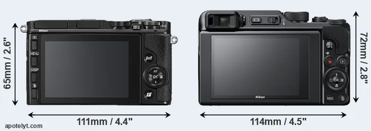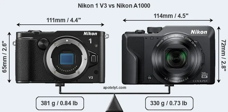 La dimensione fisica e il peso della Nikon 1 V3 e Nikon A1000 sono illustrate nel grafico sottostante. Le due fotocamere vengono visualizzate in base alle loro dimensioni relative. Tutte le dimensioni sono arrotondate al millimetro più vicino.