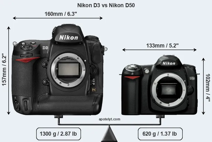 La Nikon D3 e la Nikon D50 sono due fotocamere digitali rivelate al pubblico rispettivamente a agosto 2007 e aprile 2005. Entrambe sono fotocamere DSLR (Digital Single Lens Reflex) che sono dotati di un sensore full frame (D3) e un sensore APS-C (D50). La D3 ha una risoluzione di 12,1 megapixel, mentre la D50 fornisce 6,0 MP.