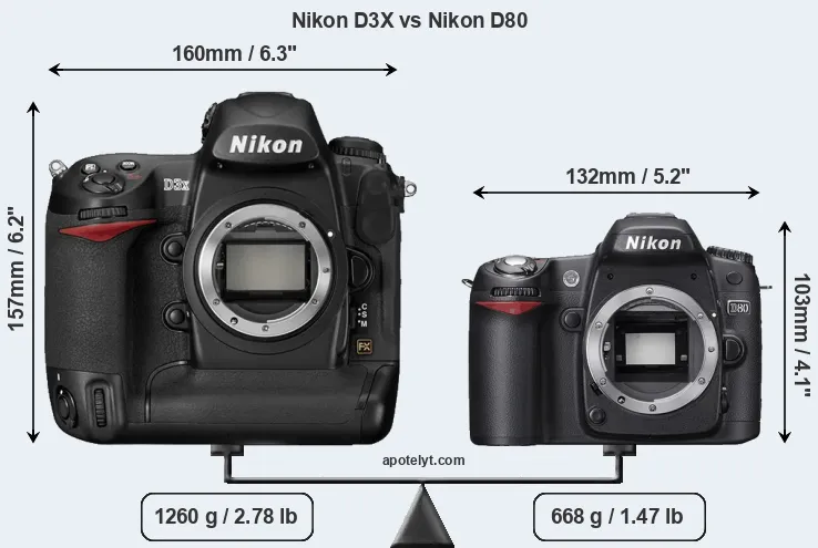 La dimensione fisica e il peso della Nikon D3X e Nikon D80 sono illustrate nel grafico sottostante. Le due fotocamere vengono visualizzate in base alle loro dimensioni relative. Tutte le dimensioni sono arrotondate al millimetro più vicino.