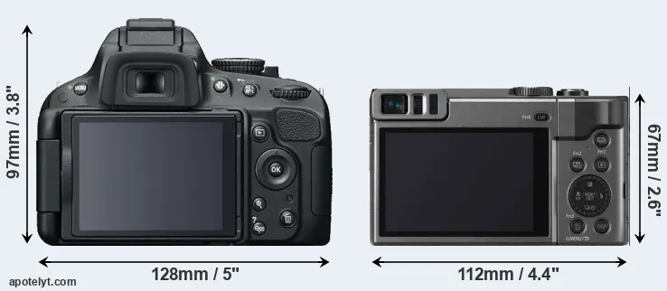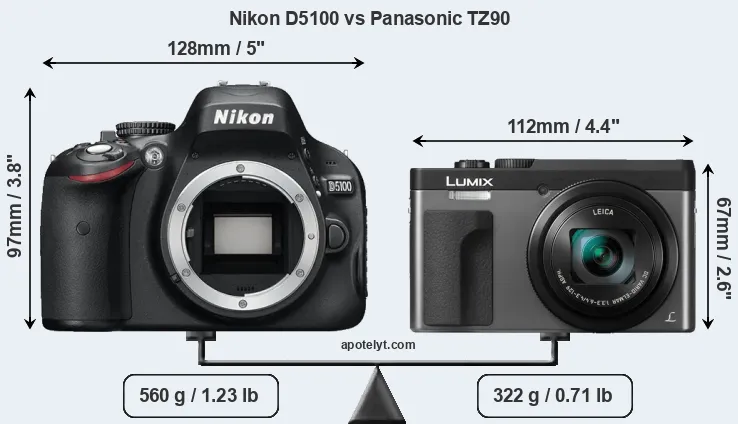 La dimensione fisica e il peso della Nikon D5100 e Panasonic TZ90 sono illustrate nel grafico sottostante. Le due fotocamere vengono visualizzate in base alle loro dimensioni relative. Tutte le dimensioni sono arrotondate al millimetro più vicino.