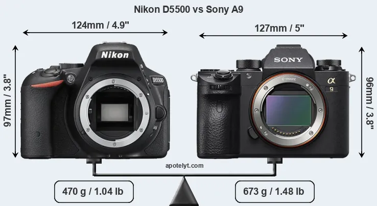 La Nikon D5500 e la Sony Alpha A9 sono due fotocamere digitali rivelate al pubblico rispettivamente a gennaio 2015 e aprile 2017. Il D5500 è una fotocamera DSLR, mentre A9 è una fotocamera mirrorless con obiettivo intercambiabile.Le fotocamere sono dotati di un sensore APS-C (D5500) e un sensore full frame (A9). Entrambe le fotocamere offrono una risoluzione di 24,0 megapixel.