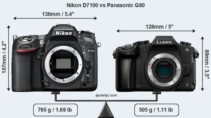 La Nikon D7100 e la Panasonic Lumix DMC-G80 sono due fotocamere digitali rivelate al pubblico rispettivamente a febbraio 2013 e settembre 2016. Il D7100 è una fotocamera DSLR, mentre G80 è una fotocamera mirrorless con obiettivo intercambiabile.Le fotocamere sono dotati di un sensore APS-C (D7100) e un sensore Quattro Terzi (G80). La Nikon ha una risoluzione di 24,0 megapixel, mentre la Panasonic fornisce 15,8 MP.