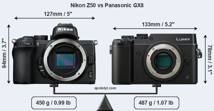 La Nikon Z50 e la Panasonic Lumix DMC-GX8 sono due fotocamere digitali rivelate al pubblico rispettivamente a ottobre 2019 e luglio 2015. Entrambe sono fotocamera mirrorless con obiettivo intercambiabile, che sono dotati di un sensore APS-C (Z50) e un sensore Quattro Terzi (GX8). La Nikon ha una risoluzione di 20,7 megapixel, mentre la Panasonic fornisce 20,2 MP.