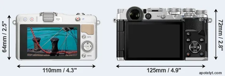 La dimensione fisica e il peso della Olympus E-PM2 e Olympus PEN-F sono illustrate nel grafico sottostante. Le due fotocamere vengono visualizzate in base alle loro dimensioni relative. Tutte le dimensioni sono arrotondate al millimetro più vicino.