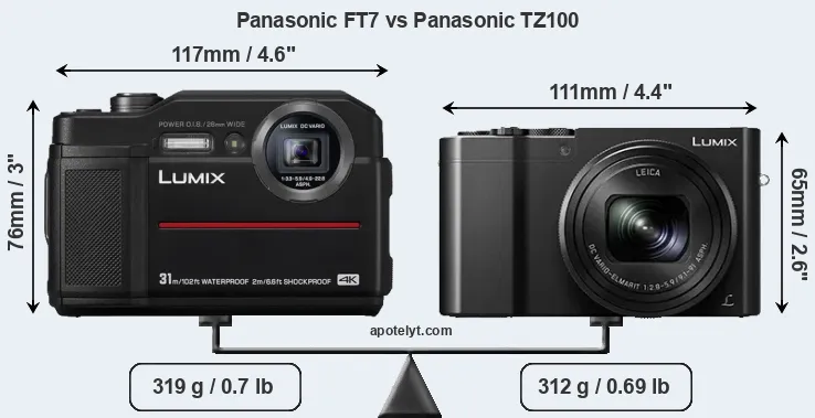 La Panasonic Lumix DC-FT7 e la Panasonic Lumix DMC-TZ100 sono due fotocamere digitali rivelate al pubblico rispettivamente a maggio 2018 e gennaio 2016. Sia il FT7 e il TZ100 sono fotocamere compatte con obiettivo integrato, che sono dotati di un sensore da 1/2.3 pollice (FT7) e un sensore da 1 pollice (TZ100). La FT7 ha una risoluzione di 20,2 megapixel, mentre la TZ100 fornisce 20,0 MP.