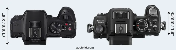 La dimensione fisica e il peso della Panasonic G6 e Panasonic GH1 sono illustrate nel grafico sottostante. Le due fotocamere vengono visualizzate in base alle loro dimensioni relative. Tutte le dimensioni sono arrotondate al millimetro più vicino.
