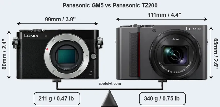 La Panasonic Lumix DMC-GM5 e la Panasonic Lumix DC-TZ200 sono due fotocamere digitali rivelate al pubblico rispettivamente a settembre 2014 e febbraio 2018. Il GM5 è una fotocamera mirrorless con obiettivo intercambiabile, mentre TZ200 è una fotocamera compatta con obiettivo integrato. Le fotocamere sono dotati di un sensore Quattro Terzi (GM5) e un sensore da 1 pollice (TZ200). La GM5 ha una risoluzione di 15,8 megapixel, mentre la TZ200 fornisce 20,0 MP.