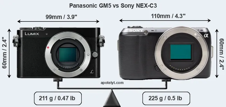La Panasonic Lumix DMC-GM5 e la Sony Alpha NEX-C3 sono due fotocamere digitali rivelate al pubblico rispettivamente a settembre 2014 e giugno 2011. Entrambe sono fotocamera mirrorless con obiettivo intercambiabile, che sono dotati di un sensore Quattro Terzi (GM5) e un sensore APS-C (NEX-C3). La Panasonic ha una risoluzione di 15,8 megapixel, mentre la Sony fornisce 16,0 MP.