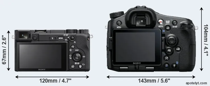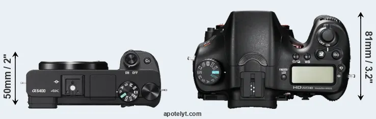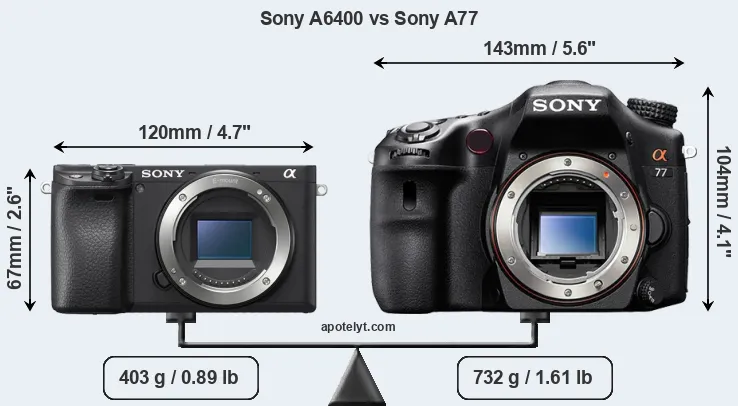 La dimensione fisica e il peso della Sony A6400 e Sony A77 sono illustrate nel grafico sottostante. Le due fotocamere vengono visualizzate in base alle loro dimensioni relative. Tutte le dimensioni sono arrotondate al millimetro più vicino.