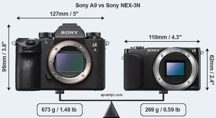 La Sony Alpha A9 e la Sony Alpha NEX-3N sono due fotocamere digitali rivelate al pubblico rispettivamente a aprile 2017 e febbraio 2013. Entrambe sono fotocamera mirrorless con obiettivo intercambiabile, che sono dotati di un sensore full frame (A9) e un sensore APS-C (NEX-3N). La A9 ha una risoluzione di 24,0 megapixel, mentre la NEX-3N fornisce 16,0 MP.